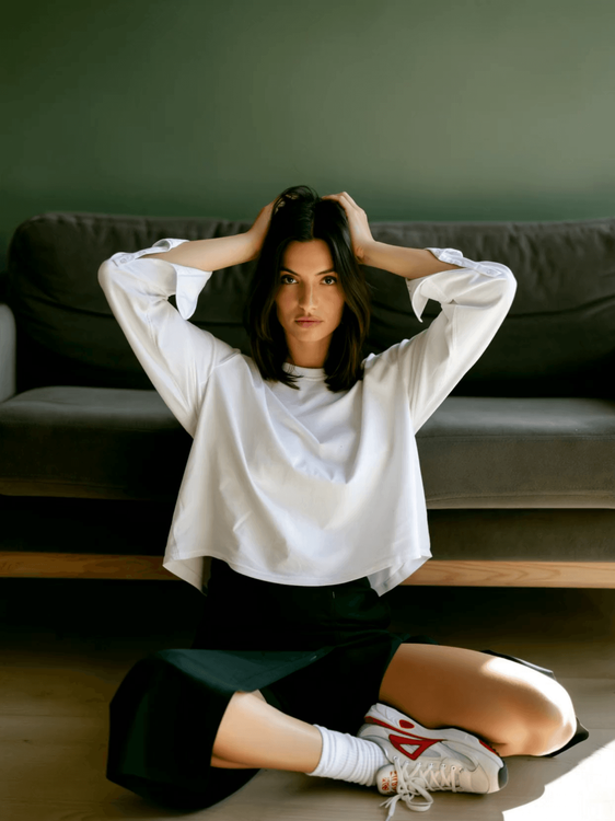 "Young woman wearing a Palace hoodie by a riverside cityscape at night"