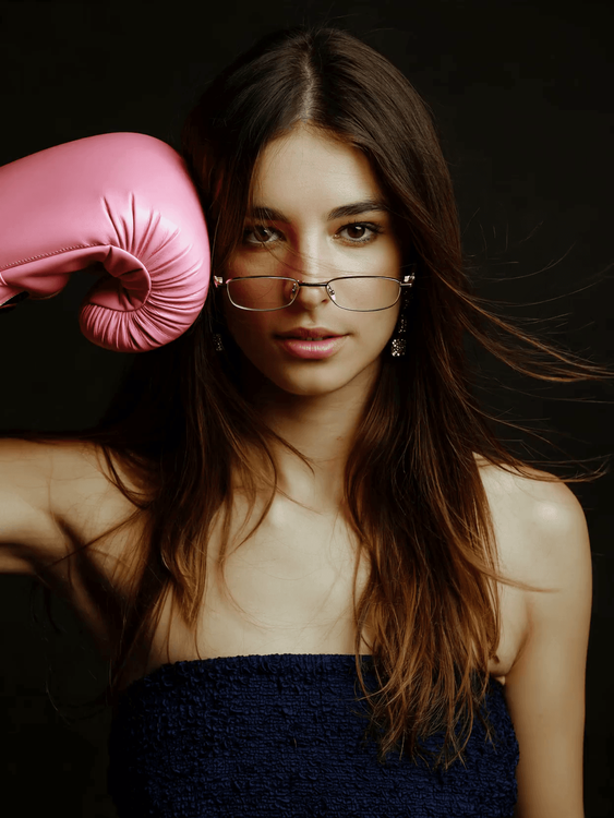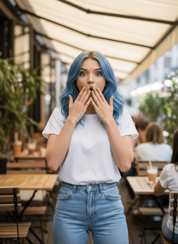 "A woman standing and looking directly at the camera under the special perspective of a fisheye lens"